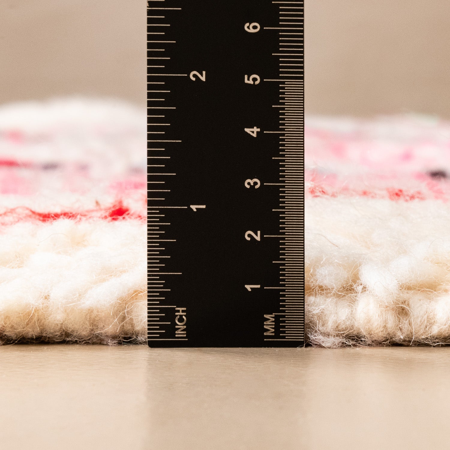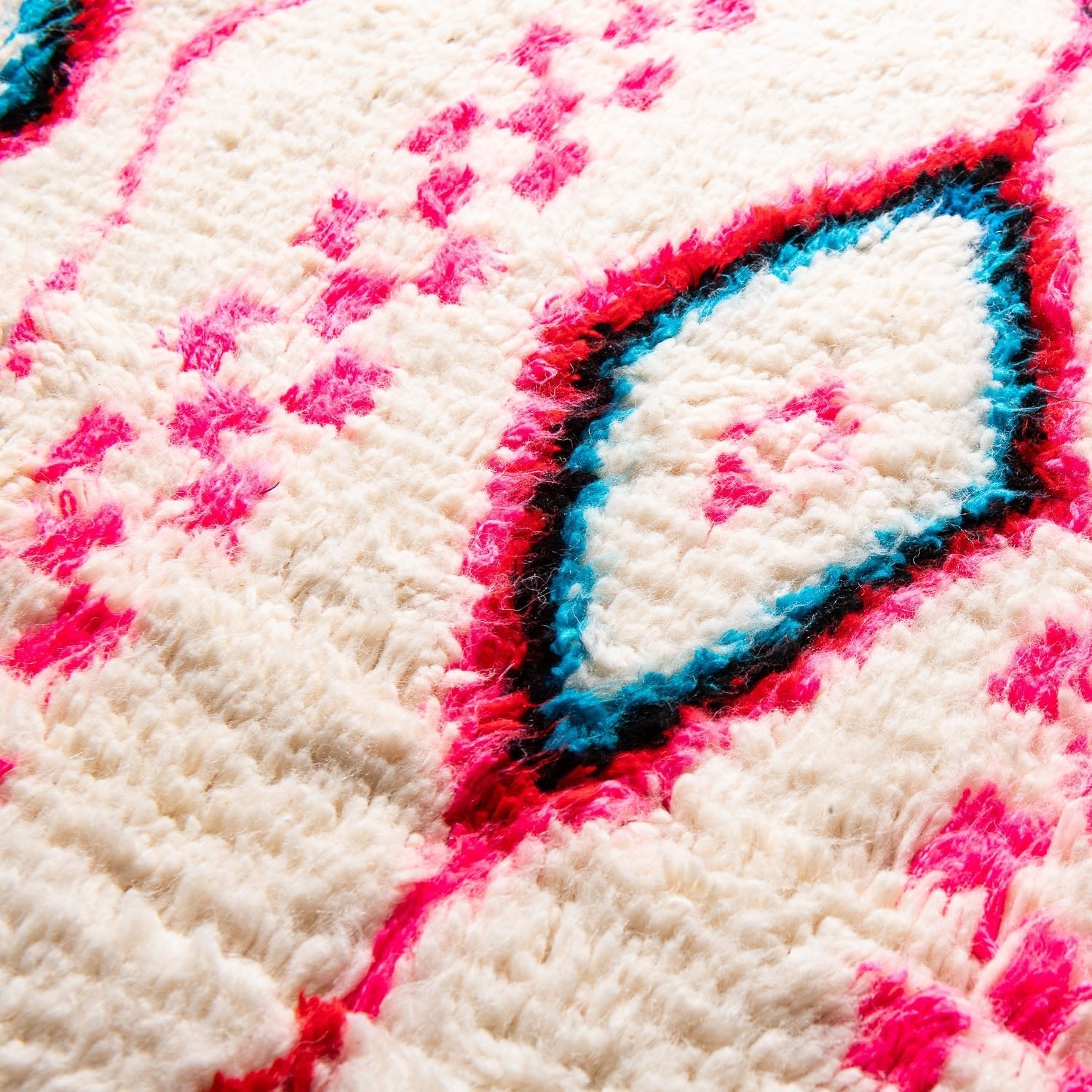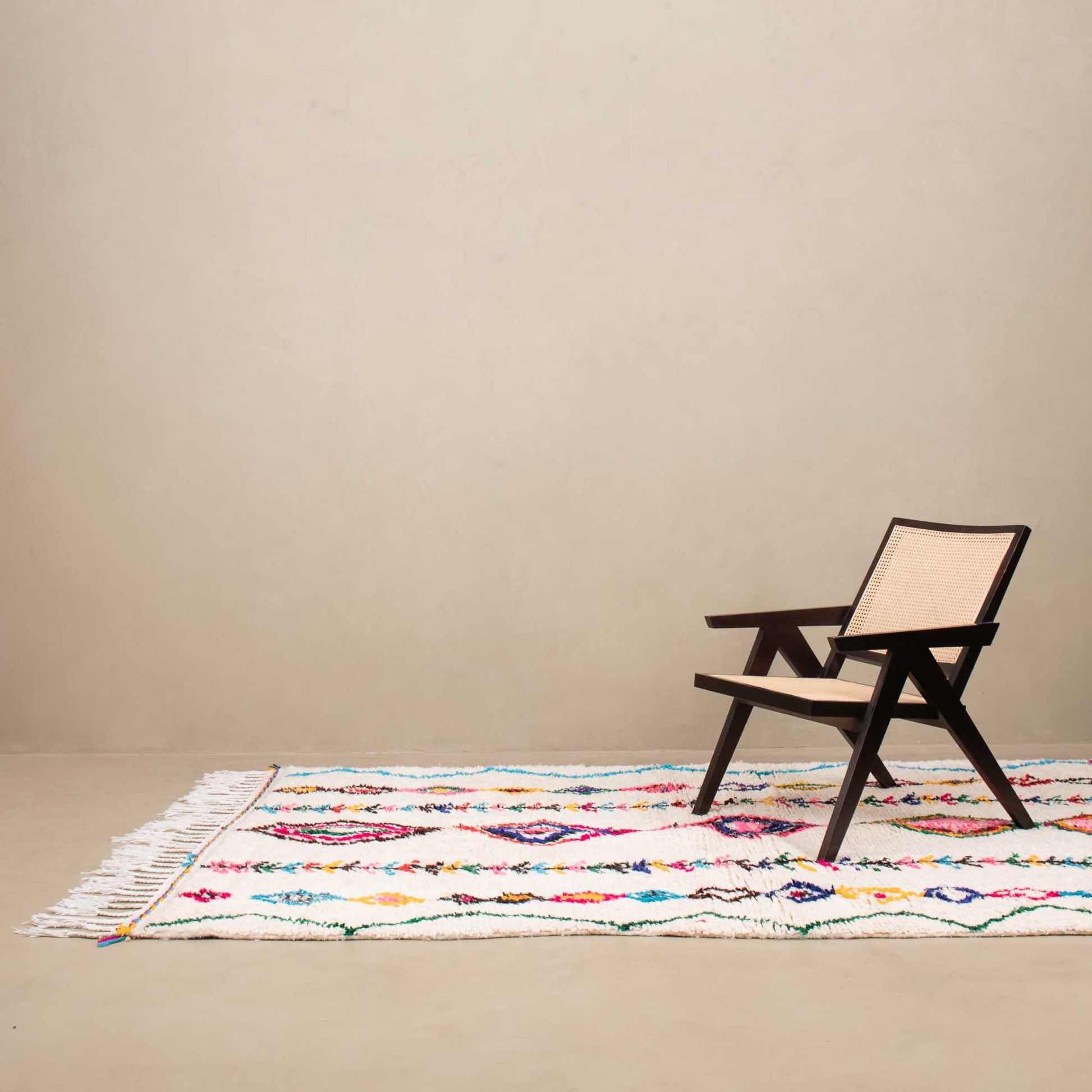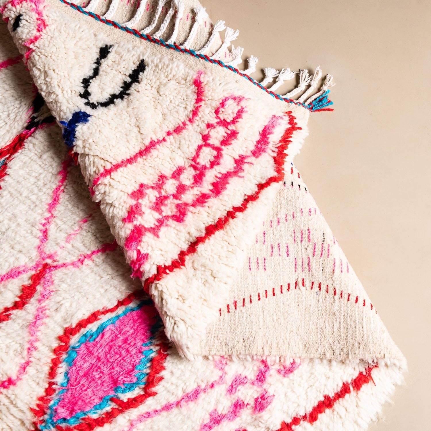 Le tapis Azilal coloré est une création artisanale en laine de mouton, confectionnée à la main sur un métier à tisser traditionnel dans les montagnes de l'Atlas au Maroc. Ce tapis vibrant se caractérise par ses motifs géométriques et abstraits, souvent dans une palette de couleurs vives et contrastées comme le rouge, le bleu, le jaune et le vert. Chaque tapis est unique, reflétant la créativité et le savoir-faire des tisserandes berbères. La laine de mouton offre une texture douce et confortable, faisant de ce tapis une pièce chaleureuse et invitante qui apporte une touche bohème et artistique à n'importe quel intérieur.